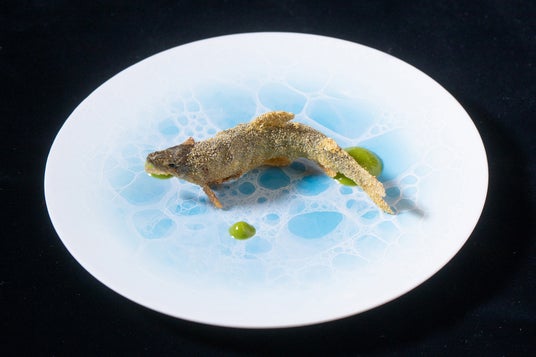 表面には、香ばしさと食感を引き立てるコーングリッツ(トウモロコシの粉)を纏わせ、丁寧に火入れ。ソースには、福岡県産の万能葱と高知県・仁淀川の山椒を使用した、爽やかな椒麻ソースを合わせました。器は、有田の窯元「やま平窯」製の"AWA"シリーズを使用。稚鮎が水の中を泳ぐ様子をイメージした一皿を表現しています。