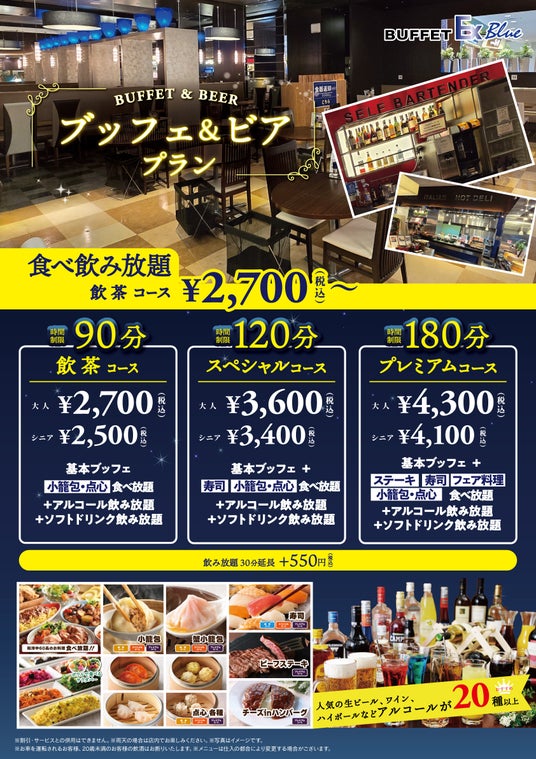【食べ飲み放題♪最強プラン登場!!】バラエティー豊かな食べ放題!ブッフェ エクスブルー イオンモール鶴見緑地にて「にぎり寿司・自家製小籠包」が楽しめる飲み放題付きコースが登場!120分制で3,600円!