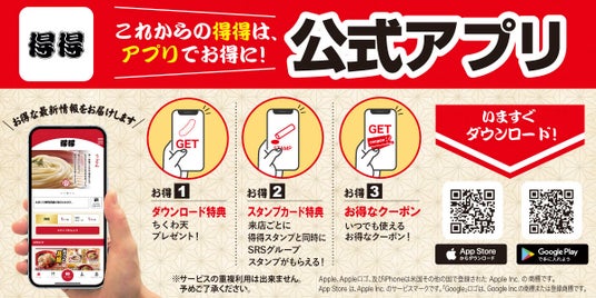 お得1 今日から使えるダウンロード特典 ちくわ天無料クーポン プレゼント!お得2 来店ごとに得得スタンプと同時にSRSグループスタンプがもらえる!