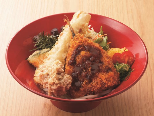 得得自慢の「得とり唐天」をトッピング、下味をしっかりなじませた唐揚げを天ぷらにすることで唐揚げのジューシーさを閉じ込めたボリュームのある一品。セットで注文すると「ミニかつ丼」「ミニ親子丼」「ミニ得とり唐天丼」「ミニネギトロ丼」から選べます。うどん3玉まで同一価格。