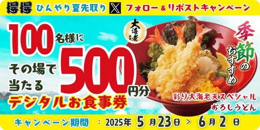 株式会社家族亭(本社・大阪府大阪市、代表取締役社長・坪山 憲司)が運営するうどんチェーン「得得(とくとく)」は、2025年5月23日(金)午後8時~6月2日(月)の期間に得得公式Xで「得得デジタルお食事券500円分」が100名様にその場で当たる「Xフォロー&リポストキャンペーン」を実施いたします。得得の公式Xをフォローし、キャンペーンポストをリポストすることで参加ができ、その場で抽選結果が分かります。「得得デジタルお食事券」は、得得の店内飲食、テイクアウトでご利用いただけます。