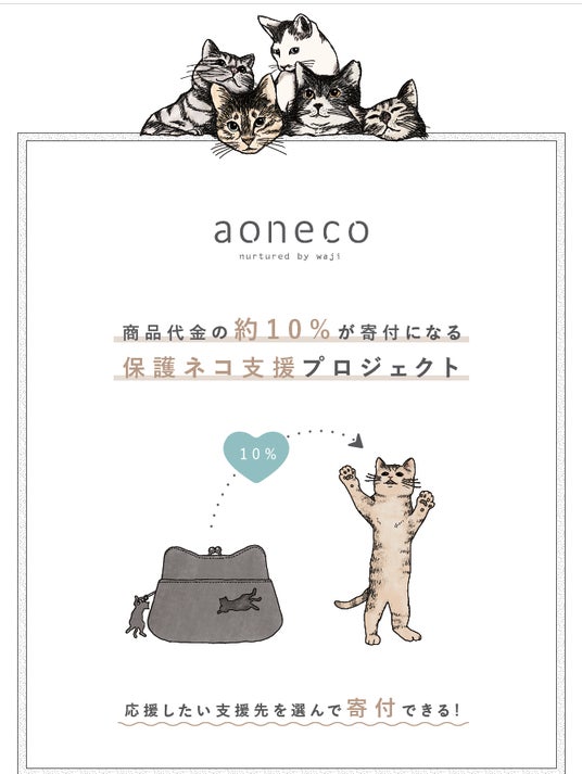 ものづくりで保護ネコ支援を行っている『aoneco』(アオネコ)のバッグや小物雑貨を販売します。上質な素材にこだわり、革のベースとなる原革は食肉の副産物のみを使用し環境に配慮した革製品です。さらに販売商品と同様に保護ネコ支援が可能なガチャガチャも店内に設置します。