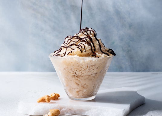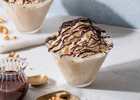 強いカカオの味わいに負けないよう、生のカシューナッツを焙煎し、白砂糖ではなくきび砂糖と合わせることで、コクと香ばしさのある濃厚なカシューナッツミルクの氷に仕上げました。カカオ本来の苦味や酸味を持つカカオマスを、より美味しく召し上がっていただくため、氷部分はジェラートのように甘く仕上げています。パリパリ食感のビターなカカオマスと、柔らかく甘いカシューミルク氷の、食感と味わいのコントラストをぜひご堪能ください。