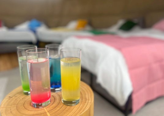 お部屋には、推しカラーをイメージしたオリジナルドリンク作成キットをご用意。自分だけのオリジナルの一杯をお作りいただけます。見た目も“推し”にちなんだ、世界にひとつだけの特別なドリンクをお楽しみください。