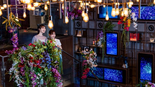 人気エリアのロビーラウンジでは、都会の喧騒をそっと忘れさせるような、どこか異国の空気も感じられるフラワーアートによる空間演出を実施しております。色とりどりの花々が彩る、まるで南国の夏を思わせる雰囲気の中、デジタルサイネージでは日本の夏の風物詩・花火のアートもお楽しみいただけます。