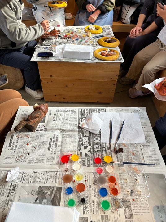 菜津子さんが彫り出した作品に色塗りをする絵付け体験の様子。菜津子さんとのコラボで完成した可愛い作品を皆さん嬉しそうにお持ち帰りになりました
