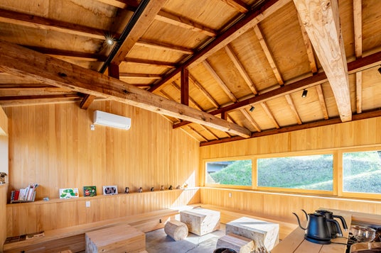ドッグカフェの内装は総ヒノキ。森の香り漂う空間で、「ワンちゃん&アート」を随時開催