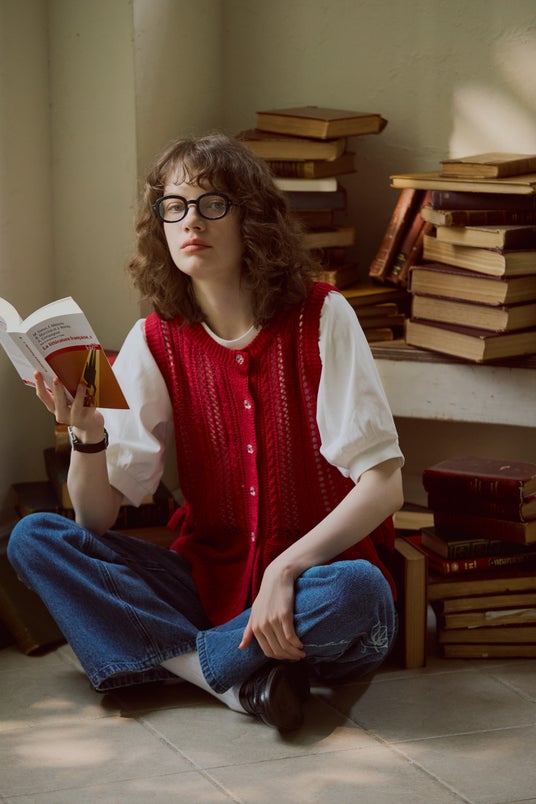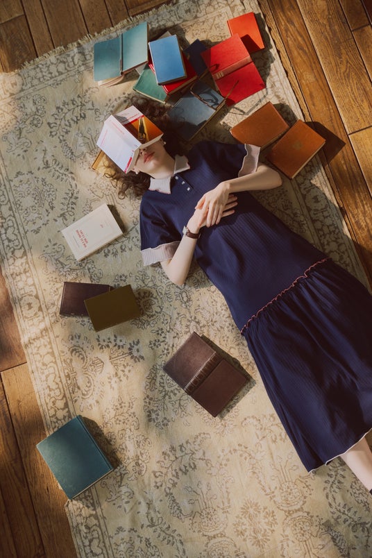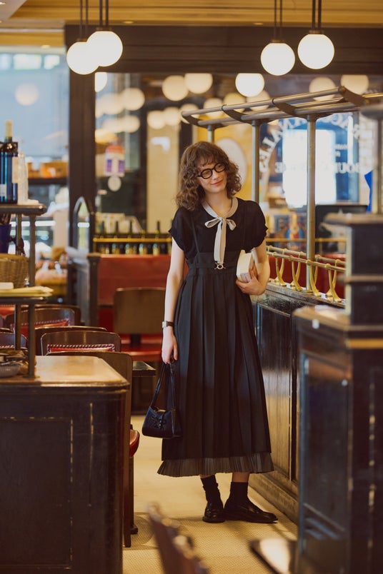 知的さを備えたアカデミックなデザインに、リボンやフリルなどの甘いディテールを組み合わせた、落ち着きのあるロマンティックカジュアルを表現した「ライブラリアンコア」コレクション。シックなムードを漂わせながらも、ほんのり抜け感のあるウェアを、フランス文学に夢中なパリジェンヌがチャーミングに纏う。