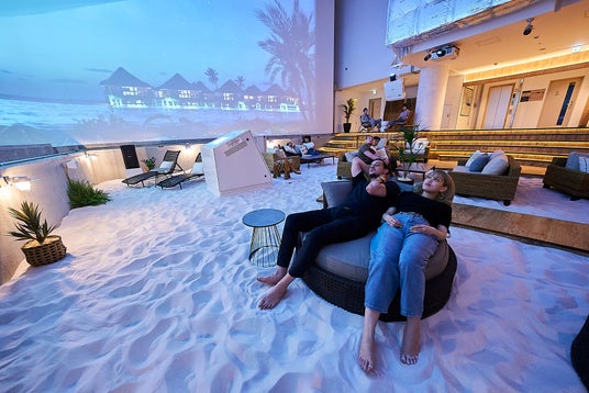 【共用スペース】25mプールをまるごとラウンジに!プロジェクションマッピング×白砂が彩る「ビーチラウンジ」