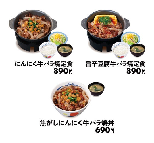松屋から夏のスタミナメニュー3種が登場します。今回の牛バラ焼定食は、ジューシーな牛バラ肉と香ばしく焼いた玉ねぎを合わせ、鉄鍋で焼いて楽しむスタイルでご提供いたします。(一部店舗及びテイクアウトは異なります)「旨辛豆腐牛バラ焼定食」は、ふわふわの玉子豆腐にピリ辛ダレとカルビダレが絡み合うバランス抜群の逸品です。「にんにく牛バラ焼定食」は揚げにんにくとにんにくの芽のダブルパンチがやみつき必至、卓上のカウンターセットのタレで自分流にアレンジも可能です。さらに、焦がしにんにくの香ばしさが食欲をそそる「焦がしにんにく牛バラ丼」も販売します。スタミナ満点の松屋の牛バラ焼シリーズでお腹も心もガツンと満たされること間違いなし! この機会に、ぜひご賞味ください。