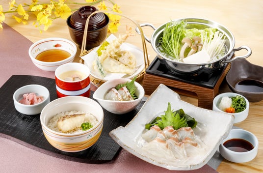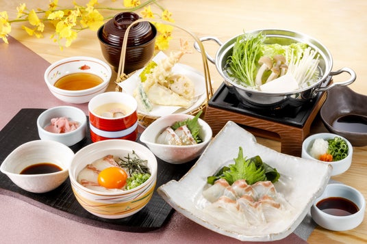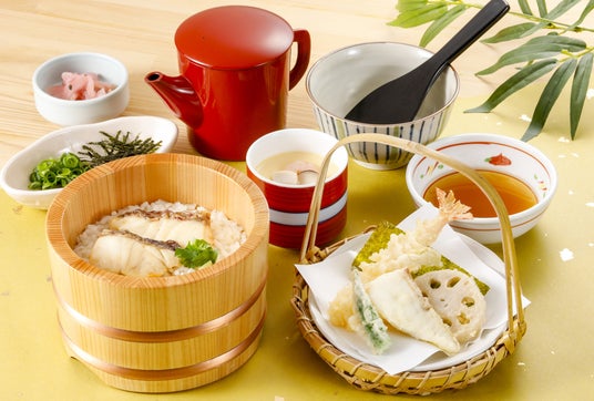 選べる 「宇和島風」または「松山風」のミニ鯛めしと、真鯛のしゃぶしゃぶ小鍋、そして、真鯛天ぷらと真鯛の胡麻だれ小鉢がセットになった真鯛を存分にお楽しみいただける御膳です。