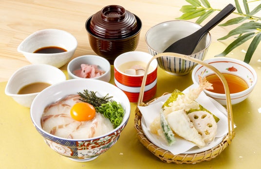 真鯛と海老・野菜の天ぷら盛り合わせと、甘めのごまだれのかかった真鯛のお刺身の小鉢にミニ鯛めしが選べる御膳です。少しずつ鯛の和膳をお楽しみいただけるお手軽なセットです。選べるミニ麺もついて、ボリュームも満点です。