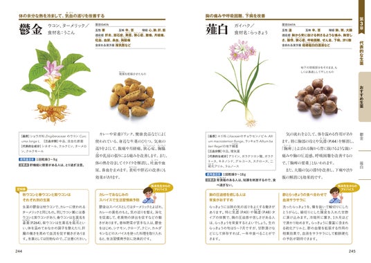 日常的に取り入れやすい、身近な食材229種類&代表的な生薬40種類について、その性質や効能、選ぶときのポイント、効果的な食べ合わせ352例と調理例を、写真とともにわかりやすく解説しました。しょうが、あずきといった、特に注目の食材はより詳しく紹介。日常に取り入れやすい食材は、野菜、果物、魚介など、種類別に分けて収録。さらに「おすすめ」食材と「もっととりたい」食材とに分け、50音順に紹介しています。