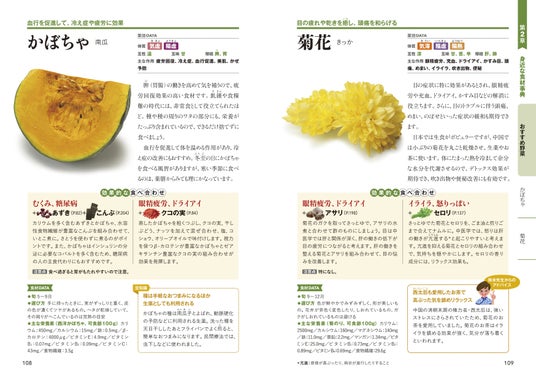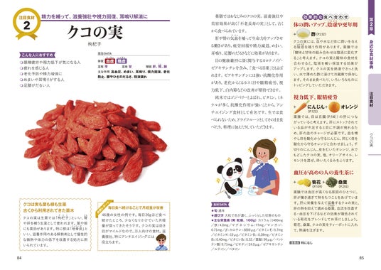 しょうが、あずきといった、特に注目の食材はより詳しく紹介。日常に取り入れやすい食材は、野菜、果物、魚介など、種類別に分けて収録。さらに「おすすめ」食材と「もっととりたい」食材とに分け、50音順に紹介しています。