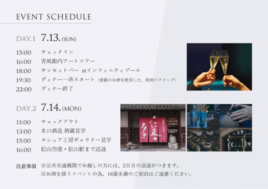 日本酒・和菓子・焼き物といった100年以上受け継がれてきた愛媛の匠の技を、実際の作り手の言葉とともに味わう特別な滞在をご用意しました。館内アートツアーやインフィニティプールでのサンセットバーなど、この日限りの限定イベントも開催。翌日には、酒蔵見学や工芸ギャラリーなど、“ここにしかない景色と手しごとに出会う旅”をご提供いたします。
