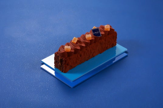パッションフルーツのシロップをしみこませたビスキュイ、カメルーン産カカオのガナッシュ、パッションフルーツとマンゴーのジュレの組合せ。