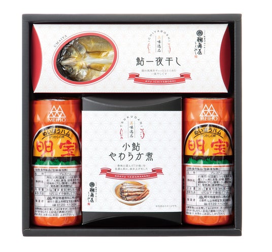 岐阜高島屋で人気だった小鮎のやわらか煮と、鮎の一夜干し・明宝ハムが味わえる詰め合わせを復刻販売。