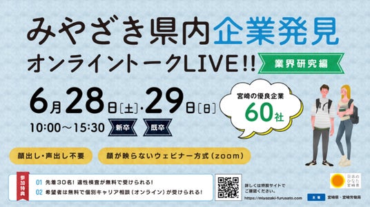 宮崎県内外に進学している大学生等や宮崎県内での就職を希望する求職者を対象に、県内企業約60社によるオンライン就職イベント「みやざき県内企業発見オンライントークLIVE!!【業界研究編】」を開催します。