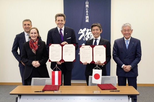 (写真:2024年4月17日旭酒造での協力覚書調印時。左から、ミヒャエル・オッター ADVANTAGE AUSTRIA代表、エリザベート・ベルタニョーリ駐日オーストリア大使(当時)、ハラルド・マーラーオーストリア連邦産業院総裁、桜井一宏 旭酒造株式会社社長、桜井博志 旭酒造株式会社会長)
