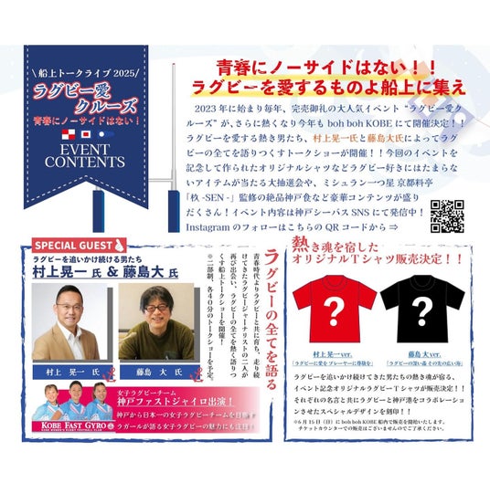 スペシャルゲストには日本ラグビー界から、最もラグビーを愛しているラグビージャーナリストの村上晃一氏と藤島大氏のお二人をお迎えし、神戸港を周遊する観光船 『boh boh KOBE』 の船上にて繰り広げられるラグビー愛溢れる熱いトークショーをクルージングと共にお楽しみいただける特別なイベントとなっています。