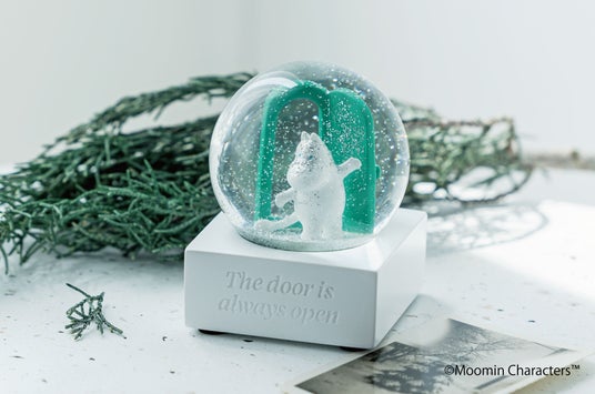 シルバーのグリッターがゆっくりと舞う様子に癒やされる、ムーミン出版80周年をお祝いするスペシャルなスノードームです。ドアの前でポージングするムーミンがとってもキュートなデザイン。全体的に落ち着きのある大人っぽい雰囲気のカラーに、開け放たれた鮮やかな緑のドアがポイントになっています。土台に刻まれた「The door is always open」のデザインも印象的です。