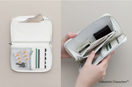 バッグの中のこまごました小物やカード類をすっきりスリムに整理整とんしてくれる使い勝手のよいポーチです。パスポートや通帳なども収まるちょうどよいサイズ感は、単体で持ち歩くのにも◎。さりげなく織り込まれたムーミン柄がお出かけ気分を上げてくれます。