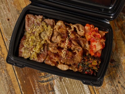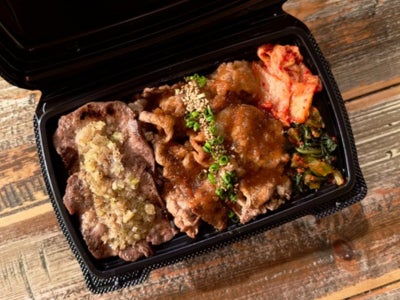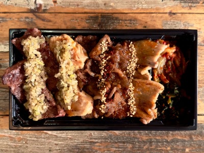KINTANのお弁当には、さっぱり食べられる自家製のネギ塩ダレ、厳選した甘口醤油をベースに野菜やフレッシュフルーツをブレンドした、風味豊かなKINTAN の特製焼肉ダレをメインで使用しております。どちらもお肉の美味しさを引き立てるだけでなく、ご飯が進む味わいになっております。