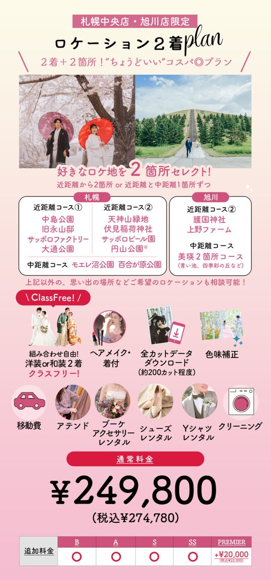 北海道札幌市にある写真工房ぱれっと中央店・旭川市の写真工房ぱれっと旭川店(本社/有限会社三景スタジオ)にて、「ロケーション2着プラン」をリリースいたしました。