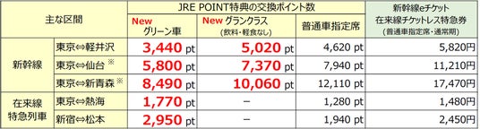 JR 東日本の新幹線・在来線特急列車のうち、「新幹線eチケット(JRE POINT特典)」及び「在来線チケットレス特急券(JRE POINT特典)」の設定がある区間