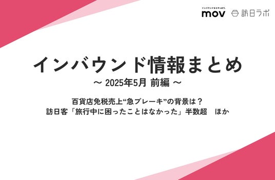 業界最大級のインバウンドビジネスメディア「訪日ラボ」及び 店舗向け集客一元化プラットフォーム「口コミコム」を運営する株式会社mov(代表取締役:渡邊 誠、本社:東京都渋谷区、以下mov)は、「インバウンドに関する最新トレンド・データ」「政府・自治体・企業などのインバウンド関連の取り組み」をはじめ、インバウンド対策に役立つニュースをまとめた「インバウンド情報まとめ【2025年5月前編】」を公開しました。