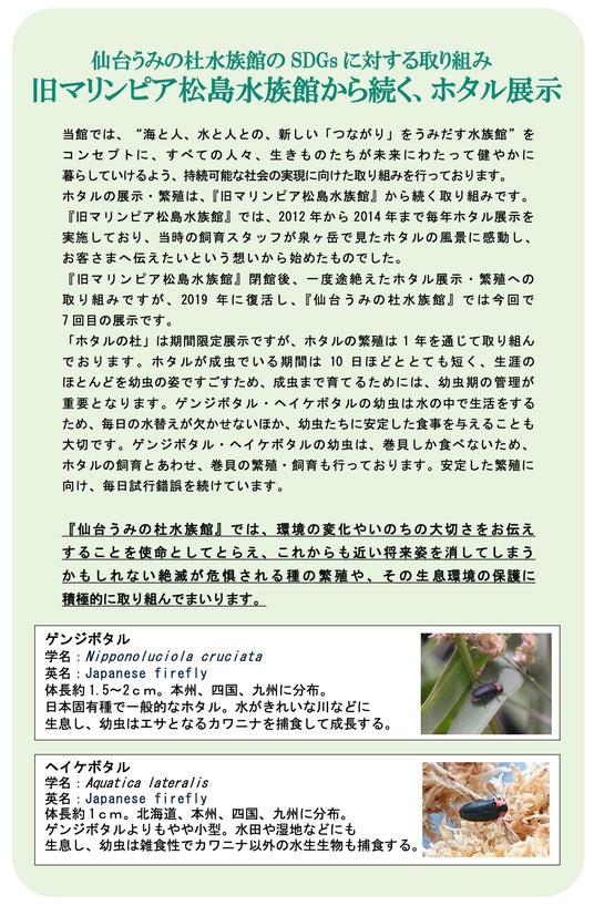 また、ホタルの生態や繁殖への取り組みについて学べる解説パネルも展示いたします。