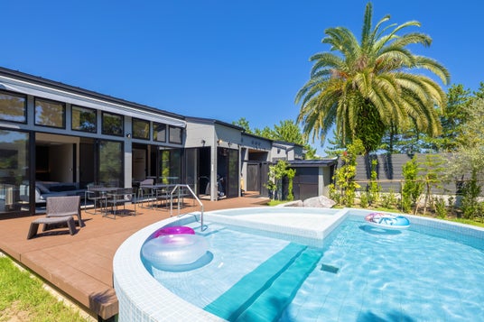 さらに全4棟のうち“KINSAI”と“AITETSU”の2棟にはプライベートガーデンに専用プールをご用意しております。直径7mの大型のプールは水深50cmと100cmの2段階に分かれており、お子様から大人まで安心してご利用いただけます。またわんちゃん専用のプールエリア(水深20cm)も完備しており、アクティブなわんちゃんも一緒に水遊びをお楽しみいただけます。
