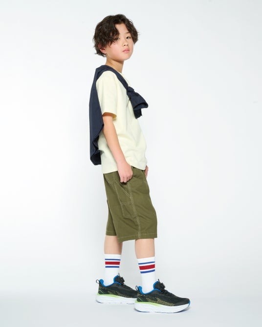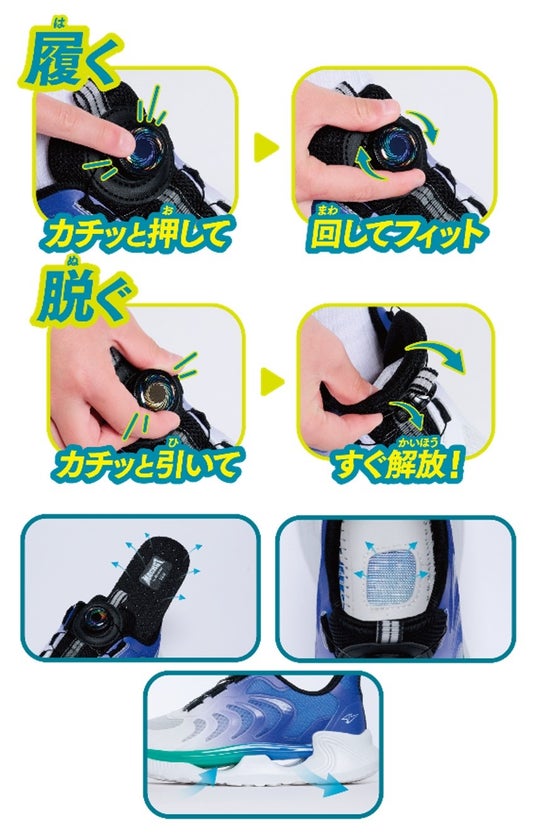 特に注目したいのが、インソールとミッドソールに通気口を備えた「ダイヤルクール」。子どもは大人よりも体温が高く、地面からの熱の影響を受けやすいため、夏場は熱がこもりやすく、熱中症リスクも高いと言われています。そんな猛暑の季節でも、360°の通気設計で足元の熱を効率よく逃がし、猛暑の夏も快適に過ごせる一足です。