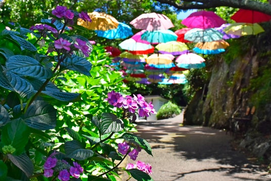 また、今年も「あじさいロード」には傘をあしらった色鮮やかな「アンブレラスカイ」をご用意いたしました。アジサイ、そして雨にも映えるフォトスポット…あじさい苑の各所でこの時期ならではの風雅な記念撮影をお楽しみ下さい。