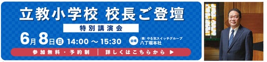 総合教育サービス企業の株式会社やる気スイッチグループ(東京・中央区、代表取締役社長:高橋 直司 以下、やる気スイッチグループ)が展開する知能育成(知育)と受験対策の幼児教室「チャイルド・アイズ(R)」は、2025年6月8日(日)に保護者向け特別講演会を開催します。当日は、私立小学校の中でも高い人気を誇る男子校・立教小学校 校長・田代正行先生をお迎えし、「立教小学校ってどんなところ?」をテーマにご講演いただきます。
