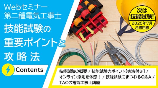 電気工事士試験対策講座を展開しているTAC株式会社(東京都千代田区、代表取締役:多田敏男)は5/25(日)に実施される『令和7年度上期 第二種電気工事士試験』の難易度分析や講評、解法などを解説する試験講評を、5/29(木)にTACのWebサイトで公開いたします。さらに!7月技能試験攻略のポイントを実演を交えてお伝えするWebセミナーを公開しています。