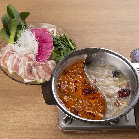 名物「麻辣火鍋」「台湾餃子」「白湯火鍋」は、2人前から注文可能なシェア前提メニュー。3種のスープを組み合わせる【ハーフ&ハーフ火鍋】も人気。