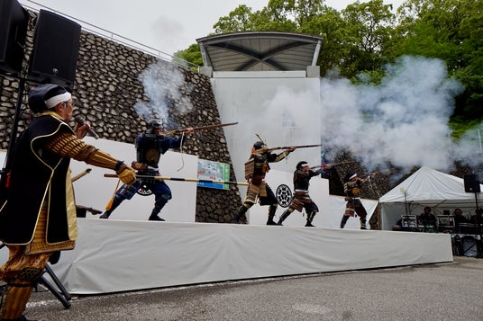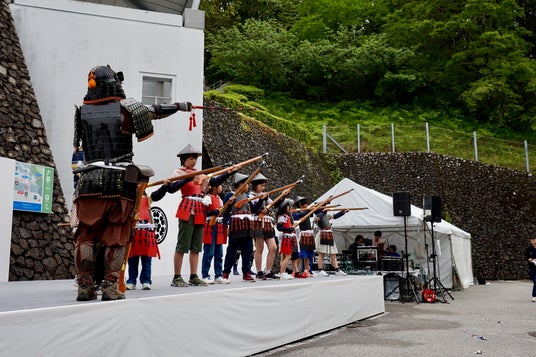 甲冑を身にまとった子ども達が登場し、号令に合わせて玩具の鉄砲を撃つ体験を行いました。