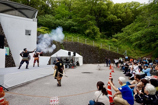 空砲の火縄銃を持った隊員達がずらりと並び、隊長の号令に合わせて発砲!すると、「ドーン!」という大きな音と同時に波動が伝わり、観客からは驚きの声が挙がりました。普段はなかなかお目にかかれない火縄銃の演武ですが、長宗我部フェスでは発砲する姿勢やタイミングを変えながら何度も体感することができました。贅沢ですね!
