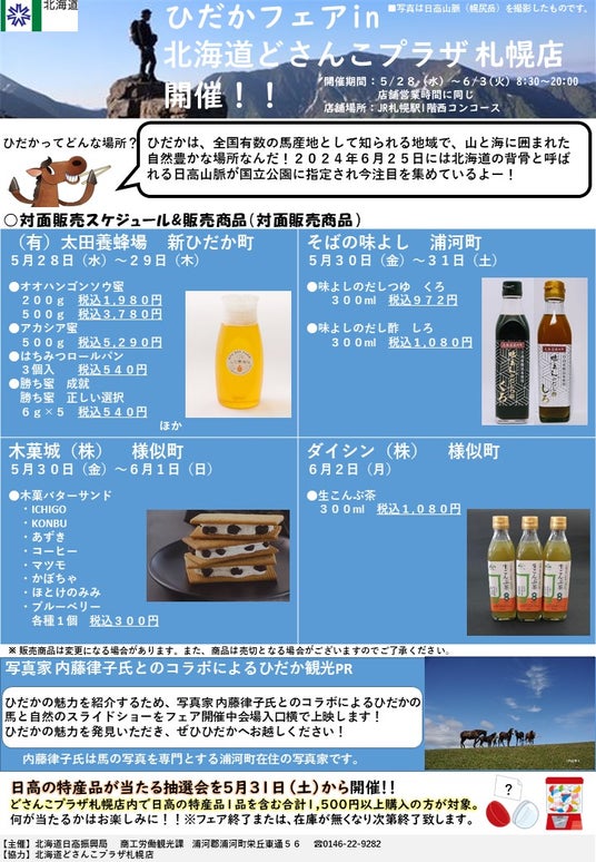 北海道日高振興局では、日高産品の消費拡大と知名度向上を図るため、JR札幌駅内にある道のアンテナショップ「北海道どさんこプラザ札幌店」で、