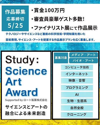 《概要》 ロート製薬株式会社の協賛により開催される「Study:サイエンス・アートアワード」は、科学技術と芸術表現の融合をテーマに、AI、バイオテクノロジー、映像、音響、プログラミング、生態系など、先端分野を活用した創造的表現を世界に問いかける公募アワードです。 ファイナリストとして選出された5組は、アートフェア会場にて新作プランを展示し、最終審査によってグランプリやロート製薬特別賞などが授与されます。賞金総額は100万円(展示費・制作費・旅費含む)。 「サイエンスとアートの融合による未来創造」をテーマに、アートとサイエンスが出会うことで社会課題への新たな視座を提示し、未来社会の創造に寄与することを目的としています。