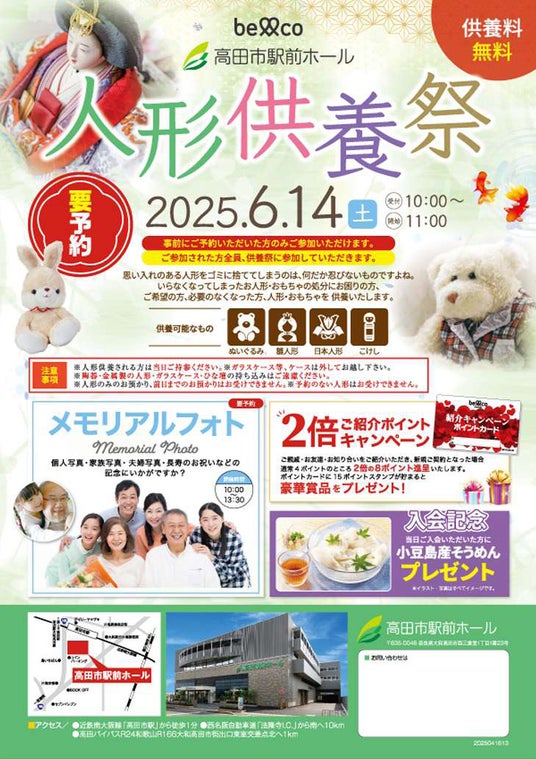 株式会社ベルコが運営する「高田市駅前ホール」では、2025年6月14日(土)に、地域の皆さまに向けた特別イベント『人形供養祭』を開催いたします。