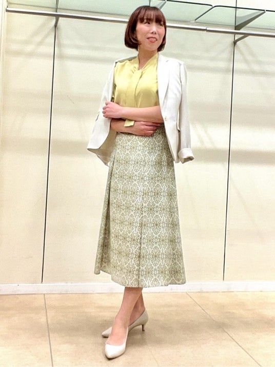 顔周りが華やぐカラートップスを取り入れたジャケットスタイル。お仕事でのオケージョンシーンは、ボウタイなどできちんと感をプラスすると◎ 明るいトーンで揃えることで、プリントボトムも主張しすぎず上品にまとまります。