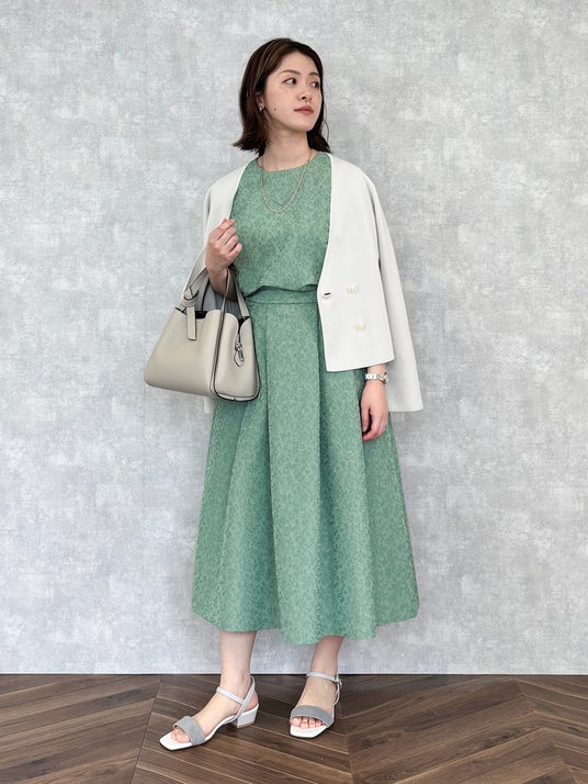 他のゲストと被りにくく、季節感が高まるグリーンカラーで華やかに。繊細な艶のあるジャカード生地は、ドレスアップしたいパーティーシーンにぴったりです。単品使いできるブラウスセットアップなら、ハレの日以外も着回しやすくデイリーに活躍しますよ。