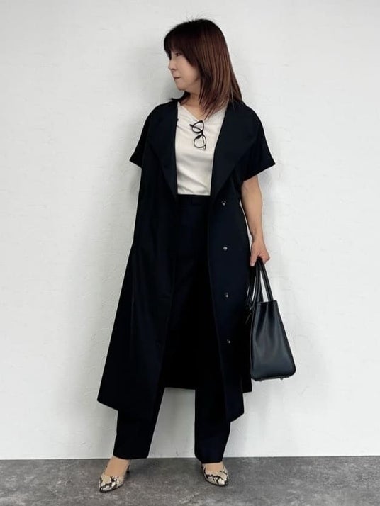 同素材のブラックワンピース×パンツで、モードなセットアップスタイルに。ワンピースのフロントを開けて羽織りとして着用することで、ブラックでも重たく見えず抜け感のある着こなしが叶います。インナーは明るい色でメリハリを付けるのがおすすめ。