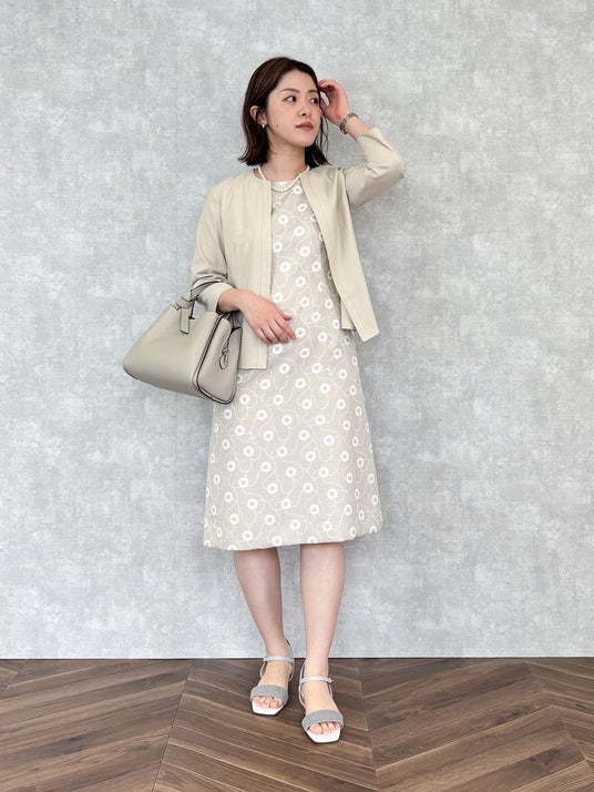 ワンピースにジャケット風ブラウスをさらりと羽織って、涼しさと好印象を両立。総柄のワンピースも、肌なじみの良いベージュトーンでまとめれば、華美になりすぎずナチュラルな表情に仕上がります。