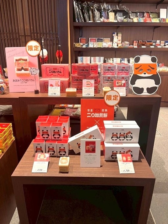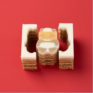 博多銘菓「二〇加せんぺい」と、人気の「パンダバウム」が出会って生まれた、ご当地限定の型ぬきバウム。卵とアーモンドがほのかに香るプレーン生地を、何層にも丁寧に焼き重ねました。その上には、白い生地をキャンバスに、にわか面をつけたパンダの表情をプリント&カット。ちょっととぼけた表情がなんとも愛らしい一品です。