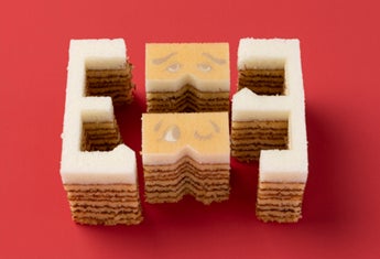 型ぬきバウムはバウムクーヘン生地を何層にも丁寧に焼き重ねています。そのバウムクーヘンの表面を白いスポンジ生地でコーティングして、その白生地にキャラクターのプリントを施すとともに、水圧で切るウォータージェットカッターでキャラクターの形にカットをしています。カットがされていますので、キャラクターの形に沿って型ぬきをしながらお召し上がりいただくことができます。
