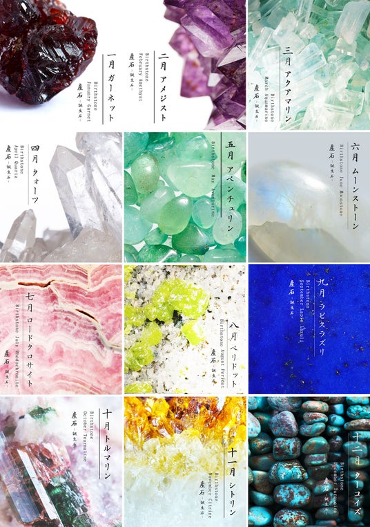 1月 ガーネット/2月 アメジスト/3月 アクアマリン/4月 クォーツ/5月 アベンチュリン/6月 ムーンストーン/7月 ロードクロサイト/8月 ペリドット/9月 ラピスラズリ/10月 オパール/11月 シトリン/12月 ターコイズ