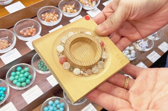 約500種類にも及ぶ天然石パーツの中から、自分の願いに合った素材を選び、デザインを考えてオリジナルのブレスレットを作成します。所要時間は約20分。旅の途中でも気軽に立ち寄れる内容で、老若男女問わず人気を集めています。専門スタッフによるアドバイスも可能です。